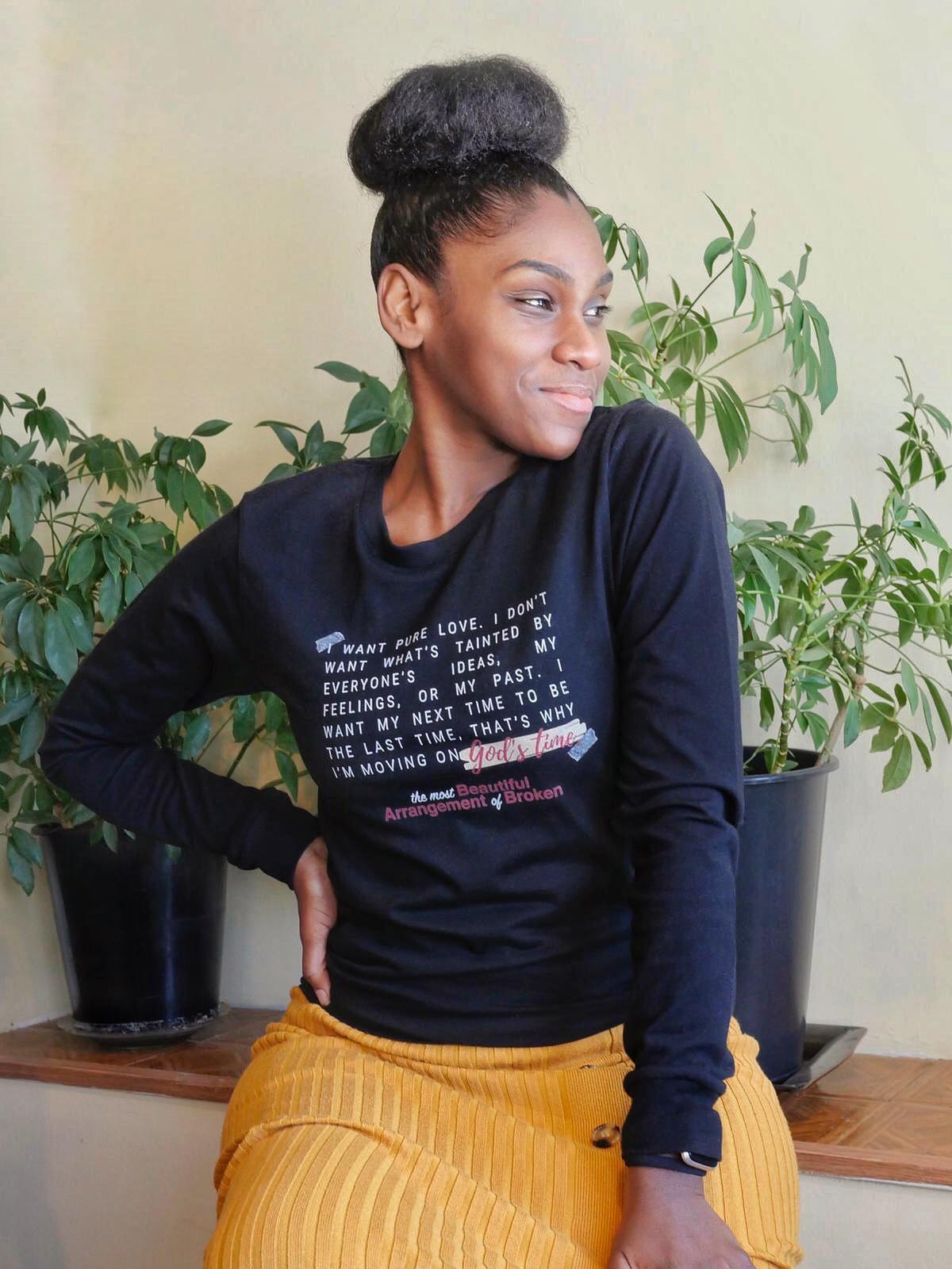 Letting go, disconnecting, and separating your heart after a failed relationship, is the hardest thing ever. However, somehow, you can still muster up hope. Inspired by Sean Brereton's series of books, The Most Beautiful Arrangement of Broken Series, the choice of better words to express these sentiments have never met a shirt. Light fabric and breathable, the quote on your chest will bring to mind the beautiful words penned by King Solomon, "He hath made every thing beautiful in his time: also he hath set the world in their heart, so that no man can find out the work that God maketh from the beginning to the end" (Ecclesiastes 3:11).